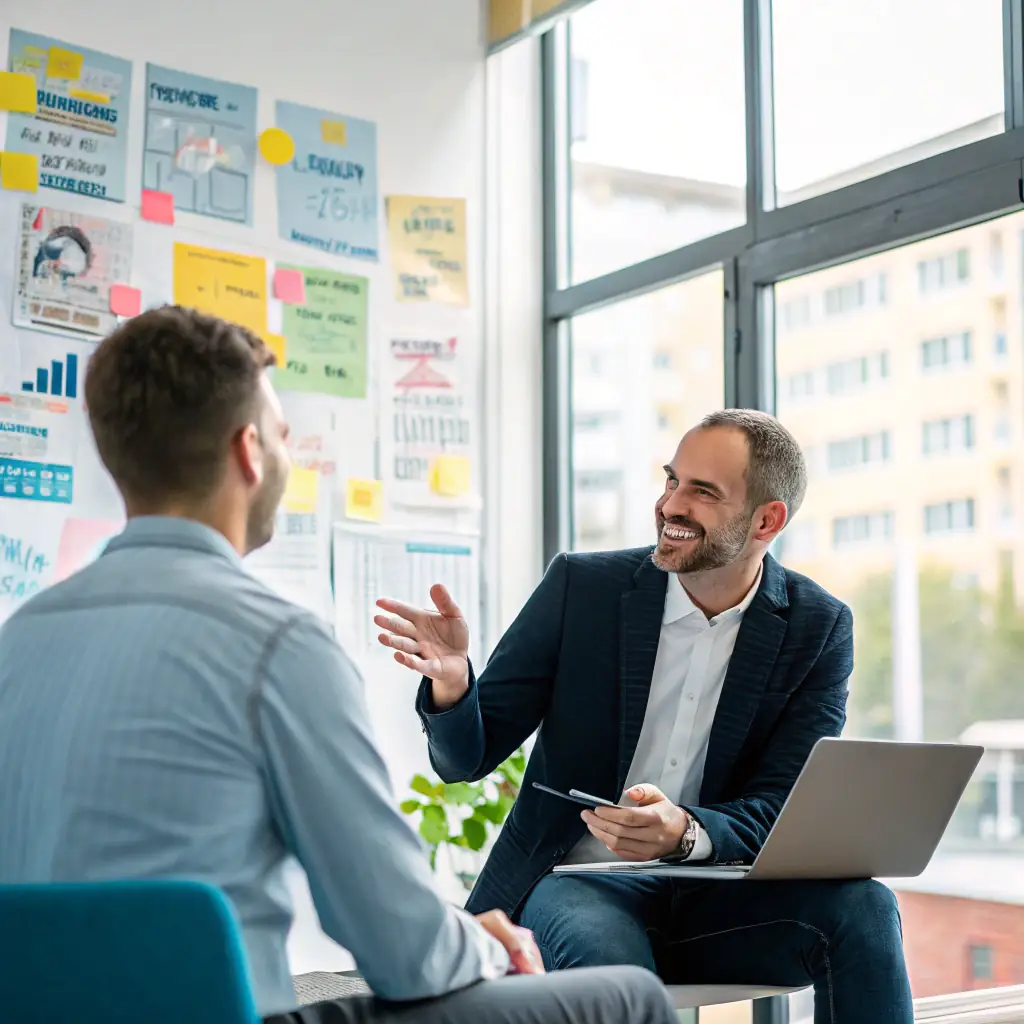 Een leider die zelfverzekerd voor een team staat, met een whiteboard vol strategische plannen op de achtergrond.